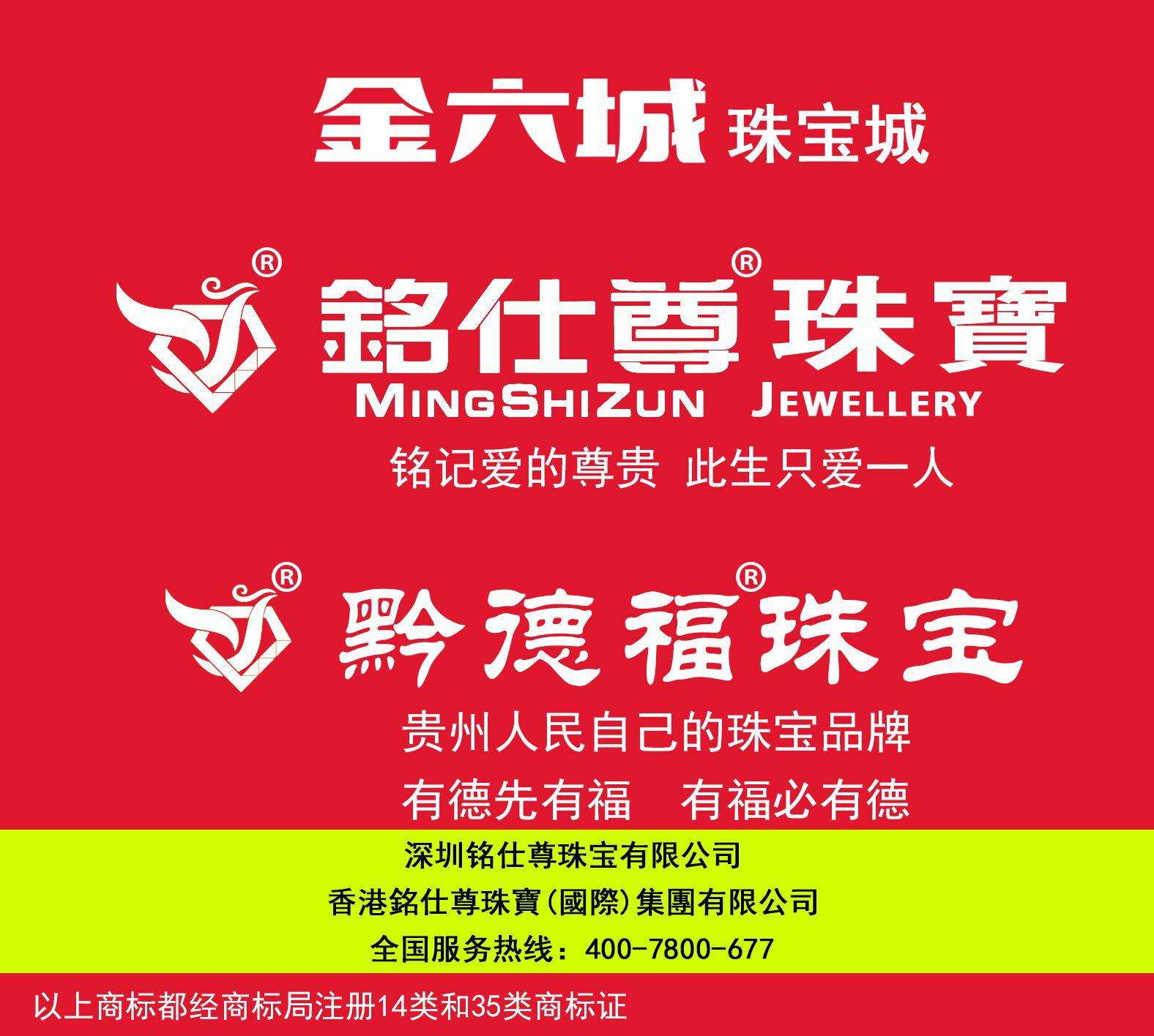 拥有铭仕尊、黔德福、铭仕尊图形、金六城14类和35类注册商标